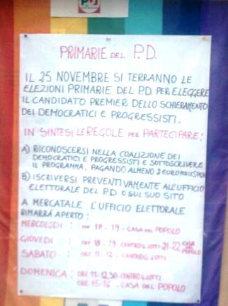 La bacheca del Partito Democratico di Mercatale in Val di Pesa infatti sembra riportare il tempo a quello del socialismo reale quando nelle fotografie ufficiali venivano rimossi gli eroi della Rivoluzione d'Ottobre poi caduti in disgrazia. Così sembra essere per le primarie del centrosinistra che, nel tatzebao affisso in bacheca, divengono primarie del PD. In vero ho stralunato gli occhi prima di mettermi a ridere. Che forse il Partito Democratico è così a corto di idee per sostenere i suoi candidati alle primarie (che sono ben tre) da dover ricorrere alla censura? Il più grande partito di quella coalizione che vorrebbe governare il paese per portarlo fuori dal disastro e dal pantano dove prima Berlusconi e poi in continuità Monti lo hanno condotto. Quasi da non credersi ma così pare.
