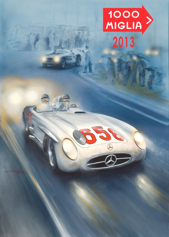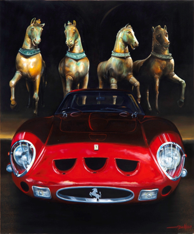 In mostra una trentina di opere tra quadri, manifesti, acquerelli, poster, realizzati dal 1989 al 2013 in cui l’automobile, soprattutto quella d’epoca, è raffigurata in chiave artistica. L’auto come scultura, come opera d’arte che non teme il confronto con i cavalli di San Marco o i bronzi di Pompei.