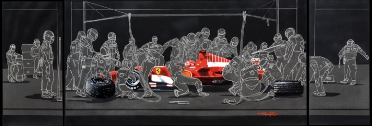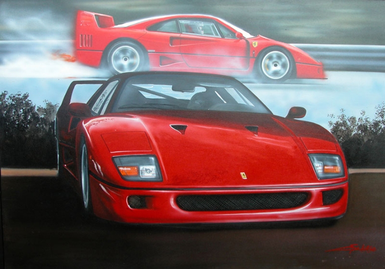 Tra i lavori di maggiore successo anche la realizzazione del marchio che celebra i 50 anni di vita della Casa di Maranello. L’opera troverà spazio tra le sale del museo di via Lucardesi insieme ad altri lavori eseguiti per la gran parte nella tecnica olio su tela, modalità che consente all’artista di proseguire la ricerca di particolari effetti di trasparenza e leggerezza dei colori.