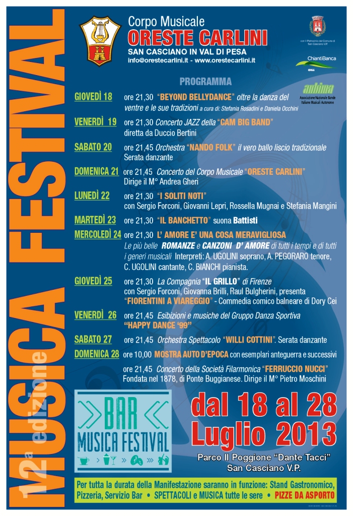 SAN CASCIANO – Inizia domani, giovedì 18 luglio, la 12esima edizione del "Musica Festival" di San Casciano, organizzato dal Corpo Musicale Oreste Carlini, con il patrocinio del Comune di San Casciano, la collaborazione di Anbima, il sostegno di ChiantiBanca.
