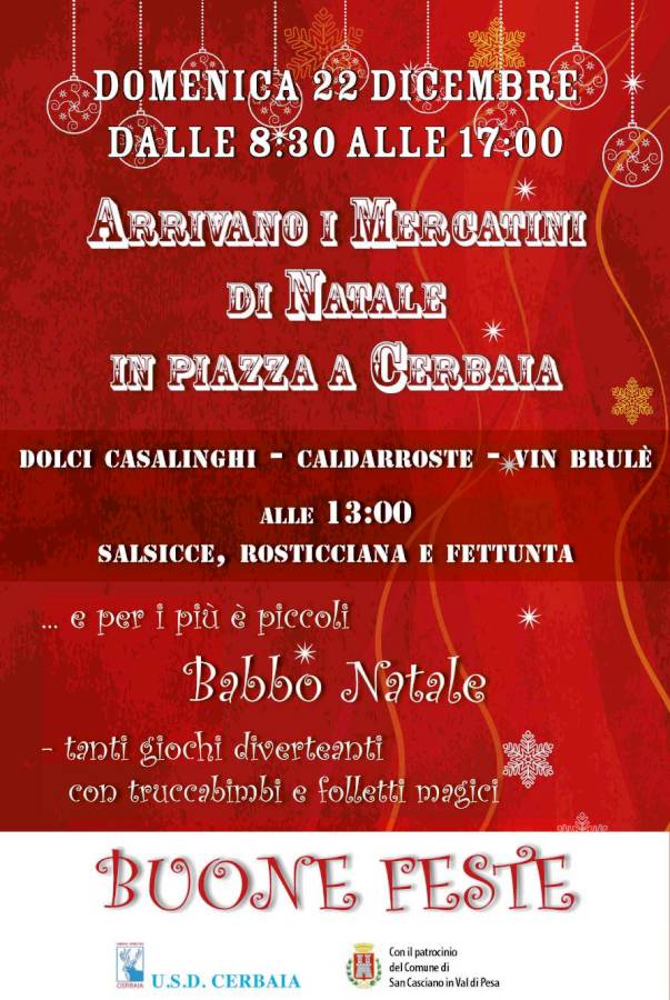 Per tutta la giornata i mercatini natalizi e Babbo Natale vi aspetteranno in piazza. Inoltre l'Usd Cerbaia sarà presente con fettunta, caldarroste, vin brulè. E, dalle 13, con salsicce e rosticciane per tutti.