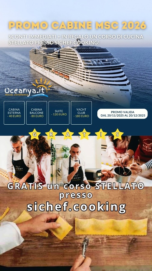 L’idea è semplice ma molto chiara: chi prenota ora una crociera MSC in partenza nel 2026 ottiene uno sconto immediato sulla cabina e, in più, un Corso di Cucina Stellato per due persone con lo chef Matia Barciulli, organizzato da SiChef Cooking Experience, del valore di 500 euro.