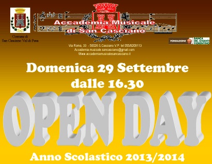 SAN CASCIANO – Domenica 29 settembre, a partire dalle 16.30 nella saletta conferenze della biblioteca comunale e nell'Arena dentro le mura, si terrà l'Open Day dell'Accademia Musicale di San Casciano.