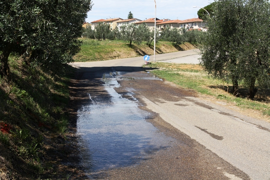 SAN CASCIANO – Da una settimana in via don Gino Gamannossi, all’altezza della Pieve di Santa Cecilia a Decimo, una perdita d’acqua interessa parte della carreggiata.
