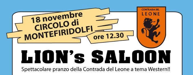 Ed ecco quindi il pranzo della contrada del Leone a tema western, organizzato per domenica 18 novembre (alle 12.30) al circolo di Montefiridolfi dove aprirà il "LION’s SALOON". Il menù infatti, assicurano i contradaioli, saprà rendere delici anche i… cow-boy più affamati. E prevede: Antipasto del Pistolero, con Fettunta all’Olio Novo, Crostini ai Fegatini, un assaggio di Zuppa del Saloon (a base di cavolo e fagioli) e Affettati. Spaghetti Western al saporito ragù; BBQ del Far West (carne grigliata). Protagonista assoluto… Gran Fegatino alla brace! Patatine Fritte. Dolci fatti in casa.