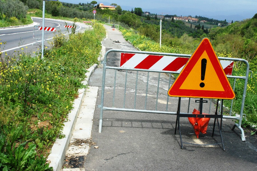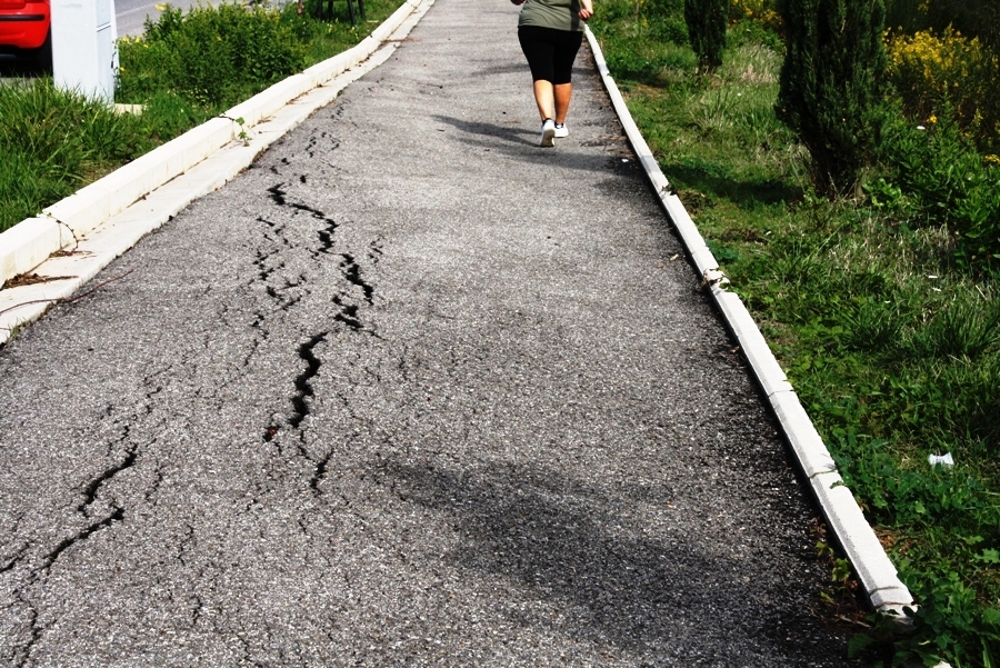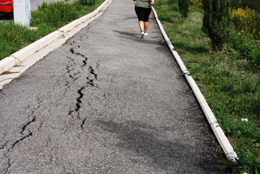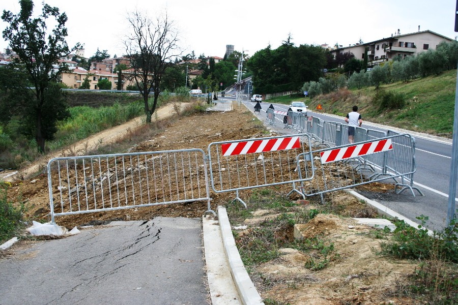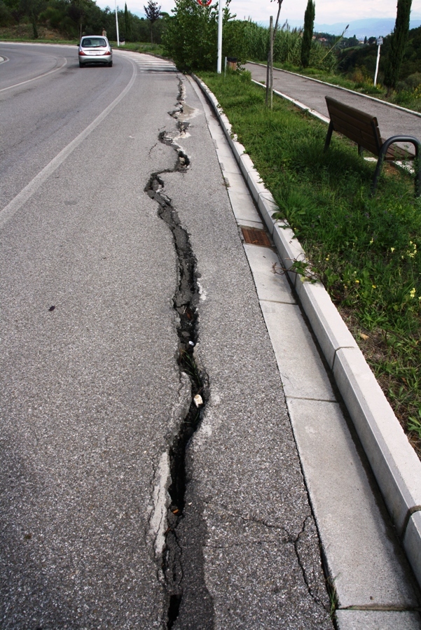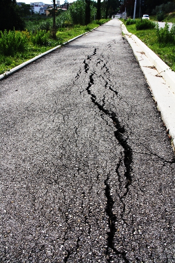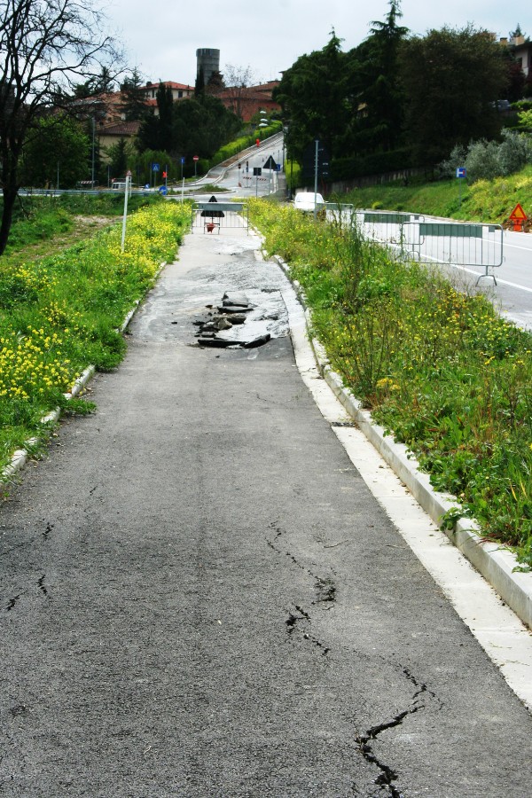 Le spaccature e la deformazione dell’asfalto sono ben visibili sulla carreggiata e lungo un tratto del percorso pedonale, esattamente nello stesso tratto in cui avvenne uno smottamento nel 2008.