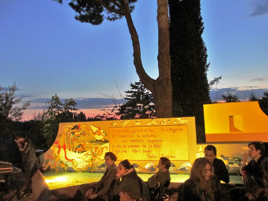 Con mura distrutte da una parte, e una vasca colorata dall’altra, dove si può leggere la breve poesia di Nadia Nencioni scritta il 24 maggio del 1999 e ancora attuale: Il pomeriggio se ne va, il tramonto si avvicina, un momento stupendo il sole sta andando via (a letto) è già sera. Tutto è finito.