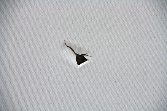 Due grossi fori sul lato alto, hanno squarciato lo schermo, e probabilmente per fare ciò, è stato usato un sasso, forse lo stesso che abbiamo fotografato ai piedi dello stesso. Questo è stato l’ultimo gesto vandalico, perché già in precedenza era stato forato in più punti nella parte bassa con delle sigarette accese.