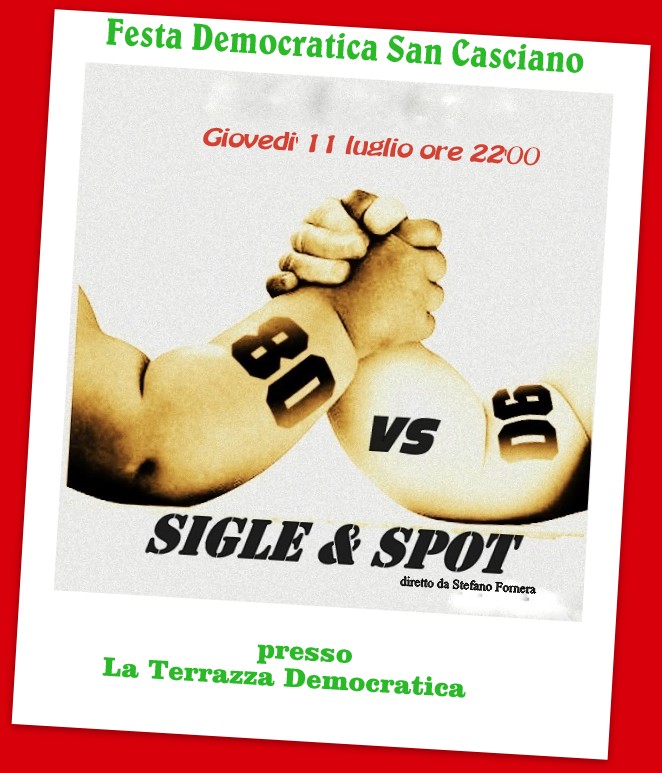 Il sancascianese Stefano Fornera ha fatto un grande regalo a tutti realizzando un video di oltre due ore, che ha chiamato "80vs90 Sigle & Spot", proiettato giovedì 11 luglio nella Terrazza Democratica nell'ambito della Festa del Pd sul Parco del Poggione. Ed è stato un successo strepitoso.