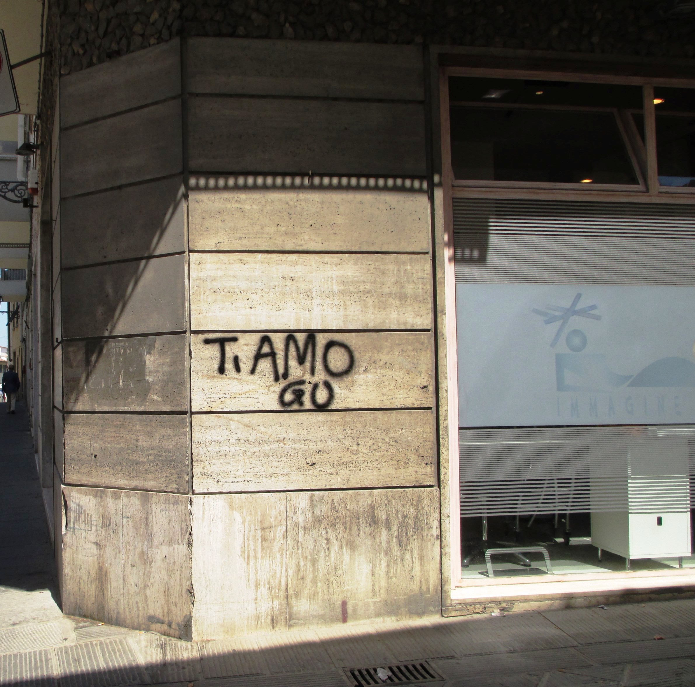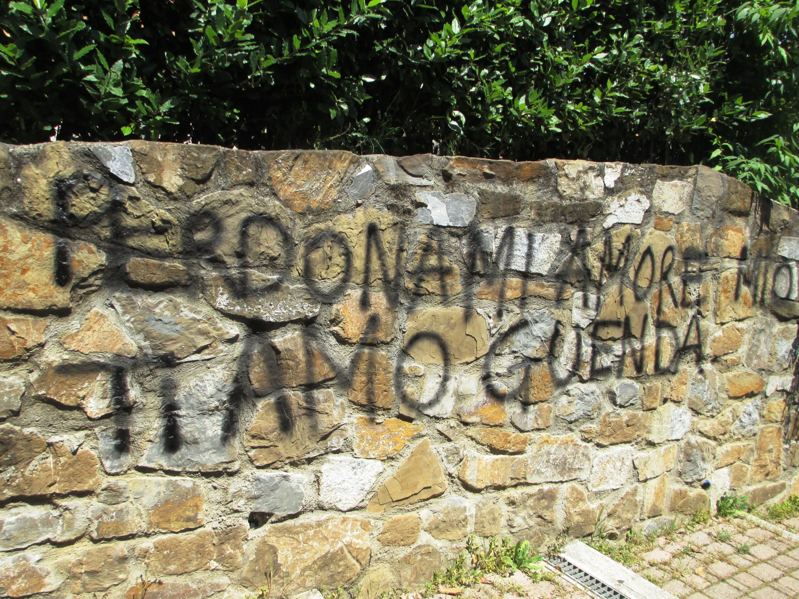 Vernice nera adoperata per scrivere messaggi alla "morosa", un gesto che, purtroppo per i proprietari dei muri, è quasi indelebile… . Magari in un’epoca in cui la tecnologia permette di inviare di tutto con telefonini, computer (o se si vuole ricorrere a vecchie tradizioni esistono ancora carta e penna),ci si potrebbero risparmiare prodezze del genre.