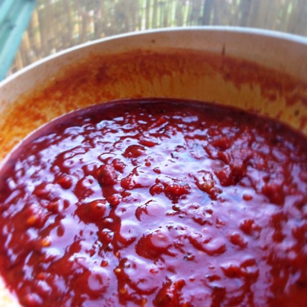 (3) Si aggiunge il pomodoro fresco e si lascia ritirare al 50%, a questo punto si aggiusta il sale e si porta alla liquidità desiderata.