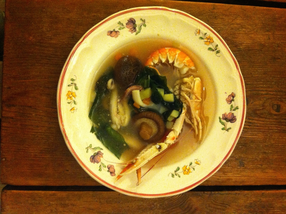 Ingredienti (per 4 persone): 4 shiitake, 2 prugne umeboshi, 100 gr di cipolla a dadini, 150 gr di carota, 150 gr di sedano, 150 gr di patate, una forchettata di alghe a scelta, cotte o ammollate, 50 gr di foglia verde, qb di sale marino fino integrale, qb di zenzero fresco grattugiato, qb di radice di kuzu, 1 calamaro, 4 scampi.