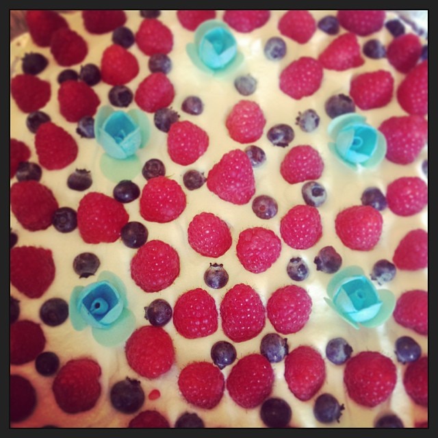 Sopra le due fette di pan di spagna si mette della panna montata e si guarnisce con la frutta che preferite, io l’ho guarnita con lamponi e mirtilli.